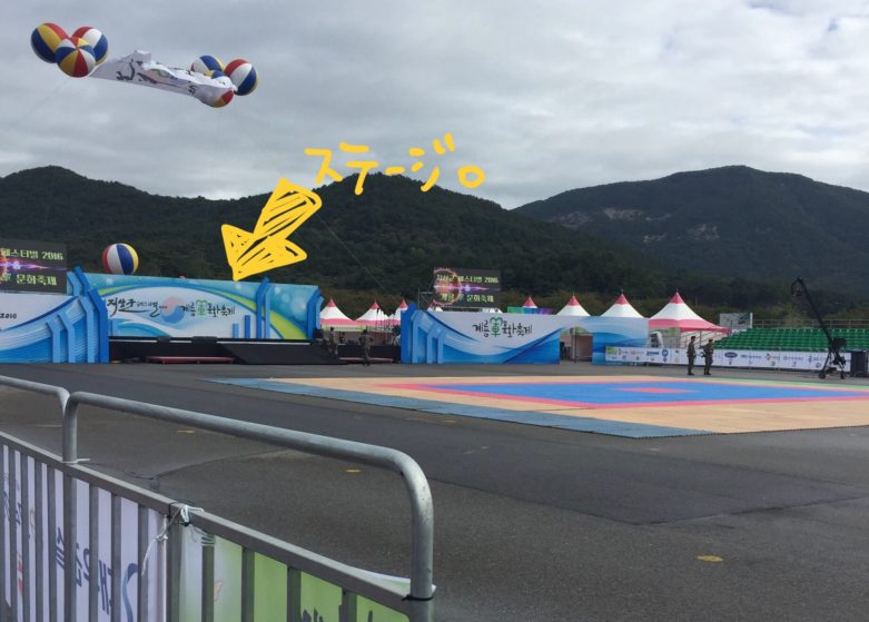 画像の右側のグリーンが観客席の椅子です。ステージ下のシートの上で