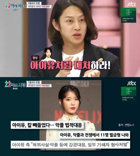 ヒチョルは「告訴が思ったより容易ではない」とし「私は放送で悪質な書き込みの話題になったら、常に『IUのように対処したら良いだろう』と言う」と明らかにし集中を集めた。IUは善処を絶対しない。