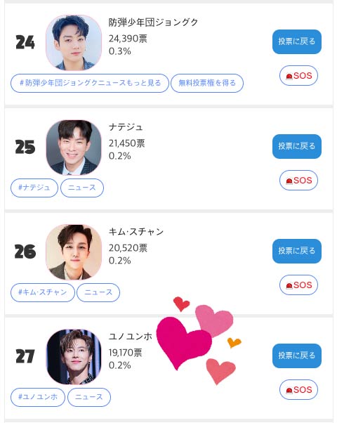 以降の順位は21位のパク・グン(21,300票)、22位のイム・ヨンウン(20,220票)、23位のナム・スンミン(19,620票)、24位のナ・テジュ(15,300票)、25位のキム・スチャン(14,820票)、26位の防弾少年表)、27位ユノ・ユンホ(12,330票)、28位ファン・ユンソン(11,280票)、29位キム・ホジュン(11,130票)、30位イ・ジュチョン(9,720票)