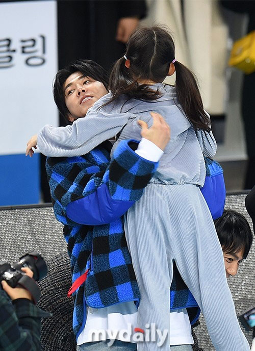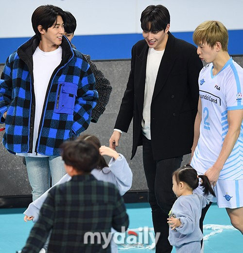 【PHOTO】東方神起 ユンホ&カン・ドンホ、バレーボールの試合を観戦…ハン・ソンス選手の娘とハグも
