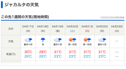 ジャカルタの天気は、天気予報のサイトごとに微妙に違うみたいです。