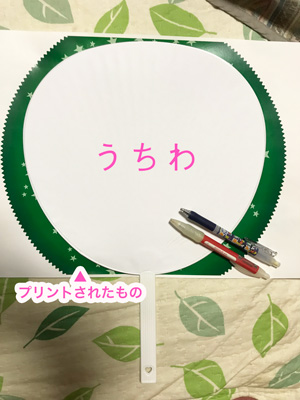 ▲印刷されたものは実際のうちわサイズより大きめになっているので、鉛筆などで『うちわ』をなぞり、印をつけてカットします。そしてうちわに貼って出来上がり!!フチなどは剥がれないようにマスキングテープなどで留めたりおしゃれにカスタマイズして下さい(*^_^*)