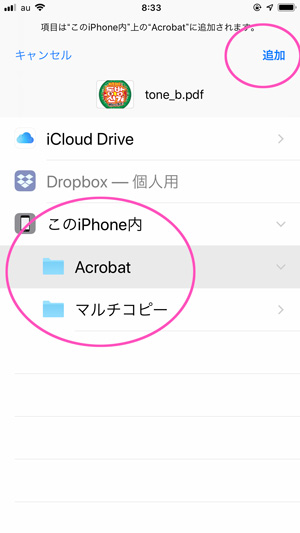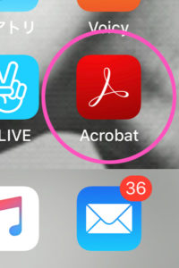 表示される画面が違う場合もありますが、自分のスマホのAcrobatと表示されている場所に保存します。