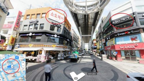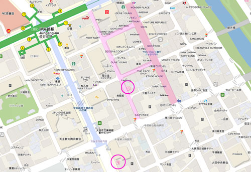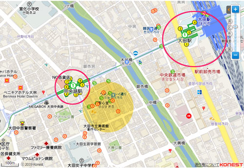 チュガンロ駅2番出口方向の黄色い●の場所は