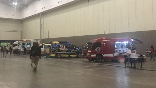 キッチンカーが7、8台販売していてイスとテーブルも配置。