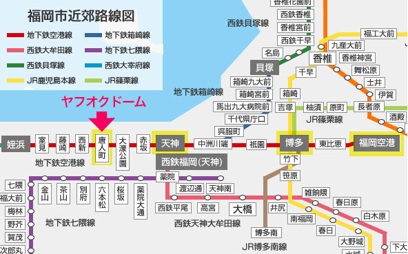ヤフオクドーム最寄りの唐人町駅は、「福岡市地下鉄空港線」。「博多駅」や「天神」、「福岡空港」まで乗り換えなしで行けます。