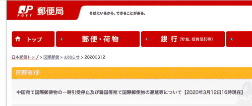 韓国発送の郵便物の遅延のお知らせがでていました。