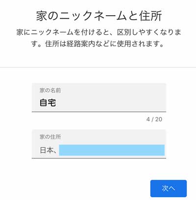 ●家の名前(好きな名称)・(クロムキャストがある場所)自宅の場合は自宅の住所を入力します。