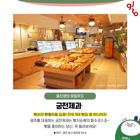 1973年には、光州広域市チュンジャンロ小さな菓子店で始めて3代目続き、宮殿製菓は、お客様の愛に成長し、現在の充利点は、咽頭点、数珠点、振越点、雲岩点、機知に富んだ点、ベトナム点までの合計7つの直営店があります。全国5大パン屋で噂がジャジャハン宮殿製菓は、自然から得られた天然酵母種でパンを作り、当日の生産と販売を原則的に健康で新鮮なパンだけ作っています。代表的なメニューでは、1989年に自社開発した恐竜アルパンと蝶パイがあります。また、夏のメニューには、直接煮100%国内産小豆で作った宮殿かき氷とミルクセーキが有名です。