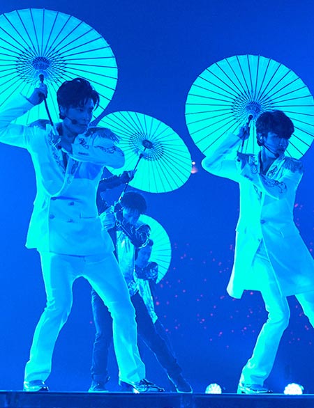 恒例となった中盤のロングMCでは、どぶろっくの「もしかしてだけど」や、8.6秒バズーカーの「ラッスンゴレライ」など、日本のギャグを織り交ぜた軽妙なトークで観客を笑顔に。この日はチャンミンが「Forever Love」を一節歌う場面もあった。