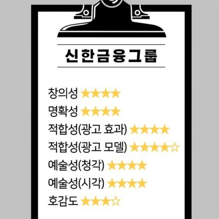 新韓金融グループの広告評価。創造性4、明快さ4、広告効果の適合性4、広告モデルの適合性4.5、聴覚的芸術性4、視覚芸術4、好感度3.5