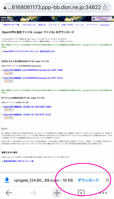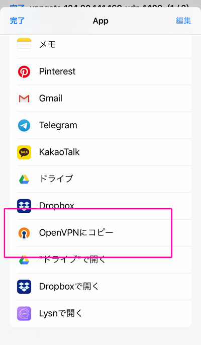 ④IPアドレスが埋め込まれている.ovpnファイルをタップ