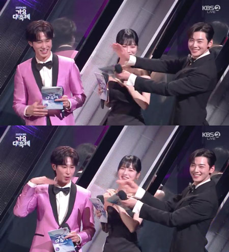 ユンホは後輩たちの舞台を見てぎこちなく笑っ同僚MCのシンイェウンとチャウン友誼反応顔まで赤くなり照れた。
