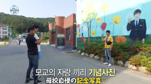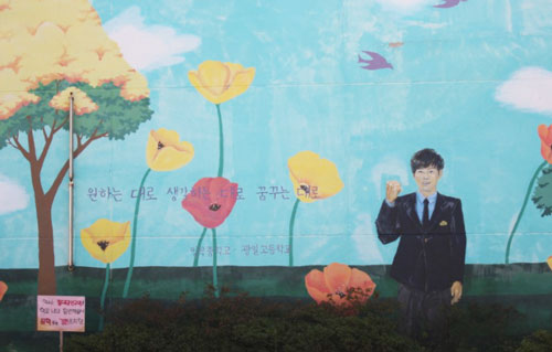 ▼学校校門前 壁いっぱいに描かれたチョン・ユンホ先輩