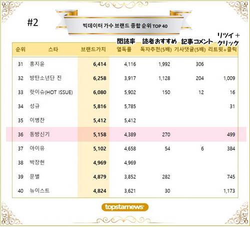 トップスターニュースで調査発表する閲覧率、読者推薦、記事コメント、リツイート総合順位など4つの指標を基準にビッグデータ歌手ブランド価値を総合した。