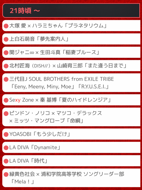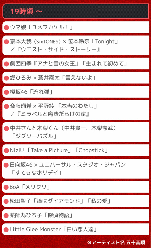 ・AI・aiko・蒼井翔太・生田斗真・ウマ娘・EXILE・大塚 愛・岡本知高・上白石萌音・関ジャニ∞・京本大我(SixTONES)・清塚信也・KinKi Kids・King Gnu・クリス・ハート・劇団四季『アナと雪の女王』・倖田來未・郷 ひろみ・斎藤瑠希・櫻坂46・笹本玲奈・さだまさし・三代目 J SOUL BROTHERS from EXILE TRIBE・JO1・JUJU・Sexy Zone・DA PUMP・DISH//・東方神起TOMORROW X TOGETHER・徳永英明・中井さんと木梨くん・なにわ男子・NiziU・秦基博・浜崎あゆみ・ハラミちゃん・日向坂46・平野綾・ピンドン・ノリコ×マツコ・デラックス×ミッツ・マングローブ・VS魂(相葉雅紀、風間俊介、佐藤勝利、藤井流星、岸 優太、浮所飛貴)・BoA松田聖子・水樹奈々・milet・ももいろクローバーZ・薬師丸ひろ子・山崎育三郎・YOASOBI・LA DIVA(森山良子、平原綾香、新妻聖子、サラ・オレイン)・LiSA・Little Glee Monster・緑黄色社会・和田アキ子・渡辺美里