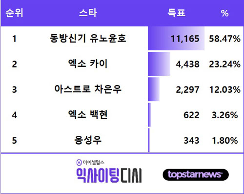 東方神起ユノ・ユンホは11,165票(58.47%)を得て1位を占めた。