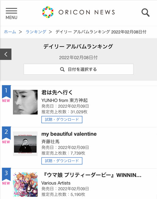 【#オリコンランキング】2/8付デイリーランキング更新!#アルバム 1位はYUNHO from 東方神起