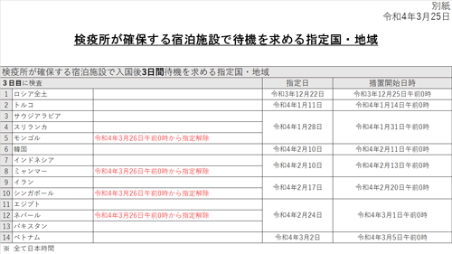 (1)検疫所の宿泊施設での待機対象となっている国・地域(以下「指定国・地域」という。)から 帰国・入国する方で、新型コロナウイルス感染症のワクチンを3回接種していない方は、検疫所が確保する宿泊施設での3日間待機を求めます。宿泊施設で受けた検査の結果が陰性であれば、退所後の自宅等待機を求めないこととします。