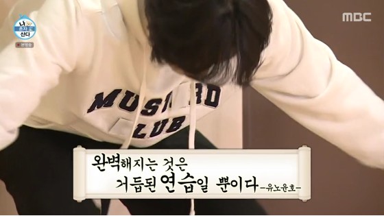続いて、朝5時から練習室で、一人黙々とダンスの練習を始め、完璧になるまで繰り返していたときの名言。「完璧になるのは、繰り返し行う練習だけだ」。自分に喝を入れ、汗をかきながらひたすら練習に励む姿が、まるで練習生のようだったが、18年目でもなお努力を惜しまないユンホ。それは練習生時代から続いている。当時、大手3大事務所(SM、JYP、YG)で情熱的に頑張ることで有名だったのが、Rain(ピ)とユンホだったというエピソードも明かした。