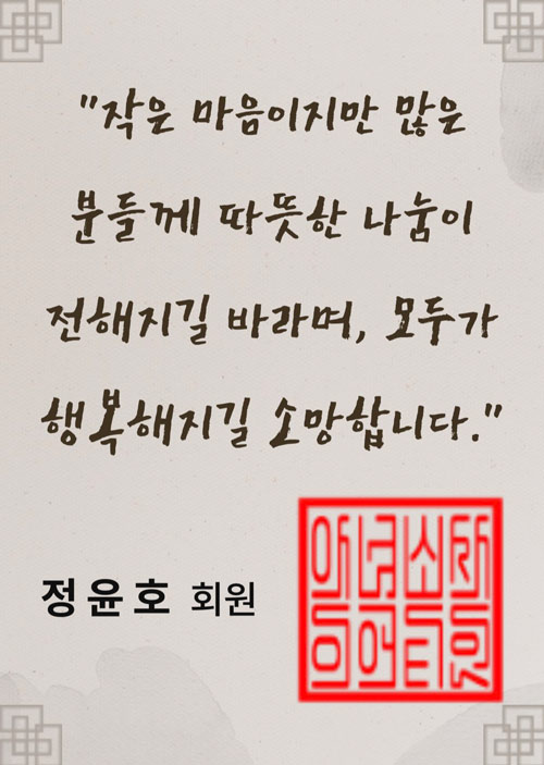 「小さな気持ちだが、多くの方々に暖かい分かち合いが伝わってほしい、皆が幸せになることを願っています。」
