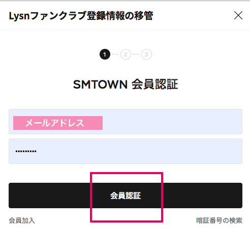 名前が変わったようですが以前のSMTOWNです。SMTOWNの登録をされている方は、その時のログイン情報を入力します。※IDはメールアドレスです。