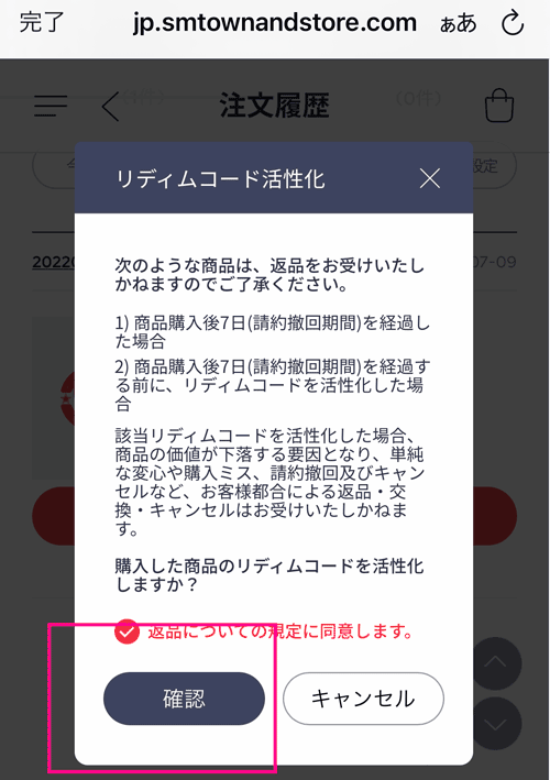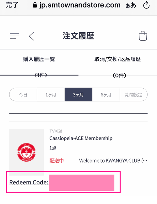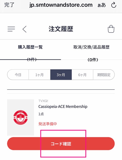 ①STOREで購入履歴一覧の”コード確認”をタップ