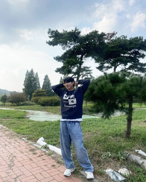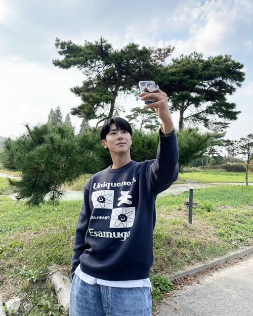 写真には、ニットにデニムパンツというラフなスタイルで、セルフィーをとったりしているユンホが写っています。