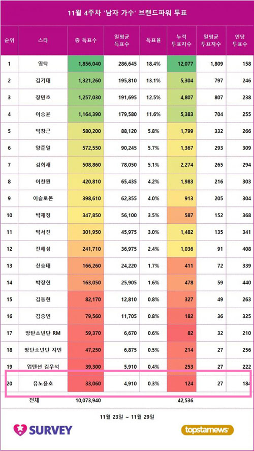 11月29日12時50分現在'11月4週目'男歌手'ブランドパワー投票'スターサーベイ投票