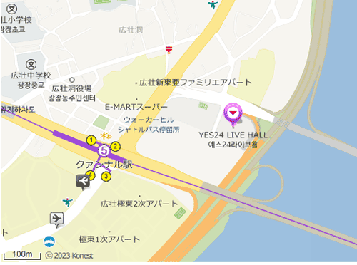 地下鉄5号線クァンナル(クァンナル、Gwangnaru)駅 2番出口 徒歩7分