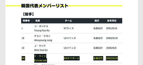 韓国のWBCの投手リストにあがっている選手