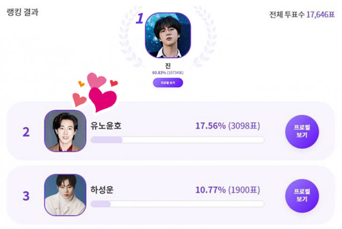 防弾少年団のジンは10,734票(61.03%)を得て1位を占めた。