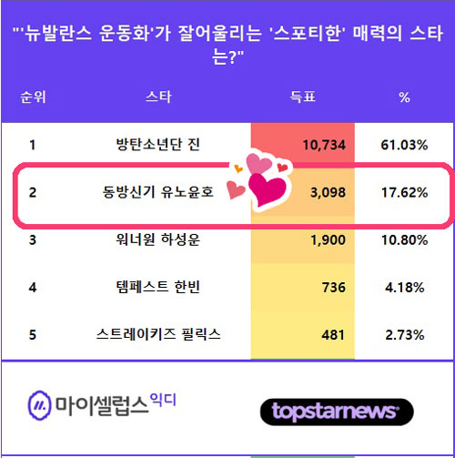 4月30日から5月6日まで行われた5月1週投票は「'ニューバランススニーカー'がよく似合う'スポーティな'魅力のスターは?」というタイトルで進行された。