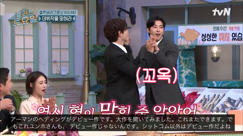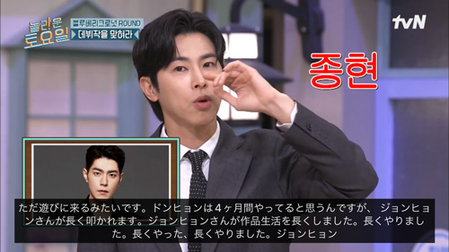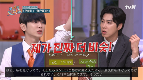 一方、過去「驚きの土曜日」で数多くの名言を残したチョン·ユンホはこの日も話術を誇る。 当時、チョン·ユンホの名言にすっかりはまったキム·ドンヒョンは、再び語録作成に乗り出し、皆を腹立たせている。 和気あいあいとした雰囲気で書き取りが始まり、チョン·ユンホとキム·ドンヒョンは意外な似た姿を披露する。 キム·ドンヒョンと引き続き意見一致を見せるかと思えば、名言製造機らしいコメントを吐き出して面白さを与えてくれる。