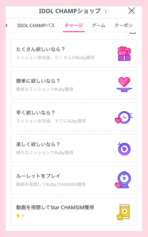 Ruby CHAMSIM(赤)だけは、ショップで実際のお金でも購入できるポイントで、それ以外は広告を見たり、コメントを投稿することでゲットできるポイントだよ!