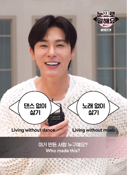 ユンホは、リアリティショー12時間撮影とドラマ12時間撮影ではリアリティショー。今回注目すべきは歌とダンスの両方。タイトル曲で需要なのはダンスと歌詞のうち歌詞。カムバックの前日にサラダを食べると韓定食を食べるでは韓定食を選び、「体力があってこそ素敵なパフォーマンスをお見せ出来る」と説明した。ダンスなしで生きると歌なしで生きるでは、ダンスなしで生きるなどを選び、それぞれウィンクで応えた。