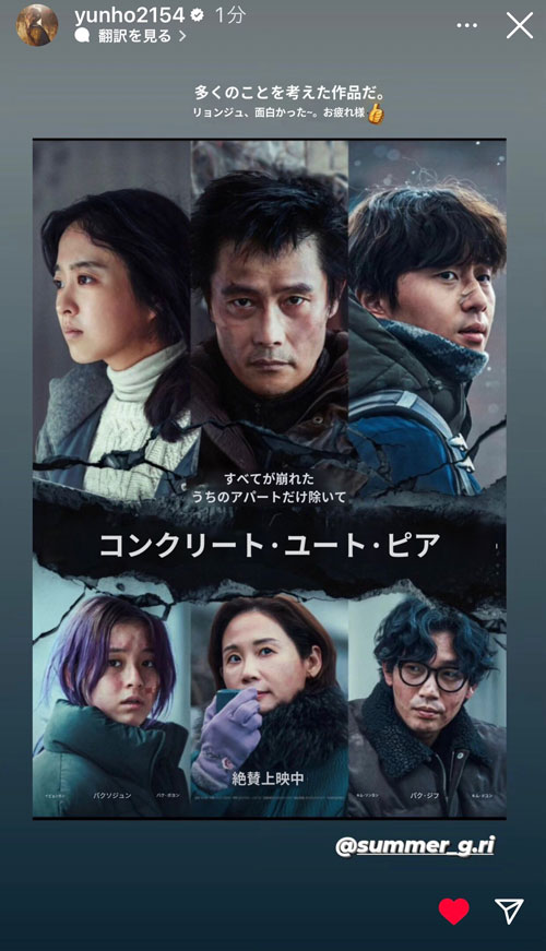 映画を見る余裕が出来たのかな♡日本公開2024年1月パク・ソジュン×イ・ビョンホン×パク・ボヨン主演映画『#コンクリートユートピア』メイン予告編(日本語字幕付き) https://t.co/w7xW57S9Ce @YouTubeより #콘크리트유토피아 #YUNHO #UKNOW pic.twitter.com/NZqP6toCfe