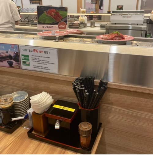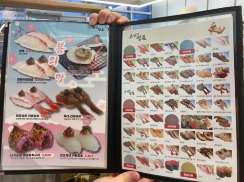 後ろにお刺し身のメニューとお寿司のラインが見えて