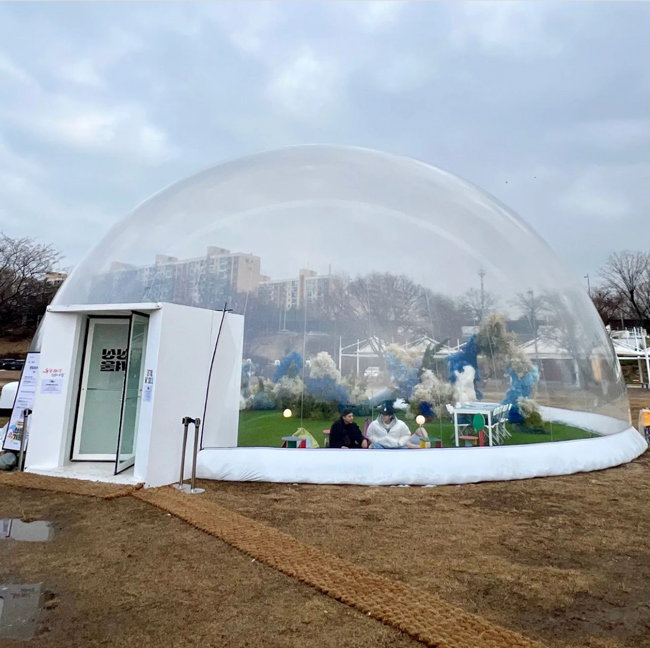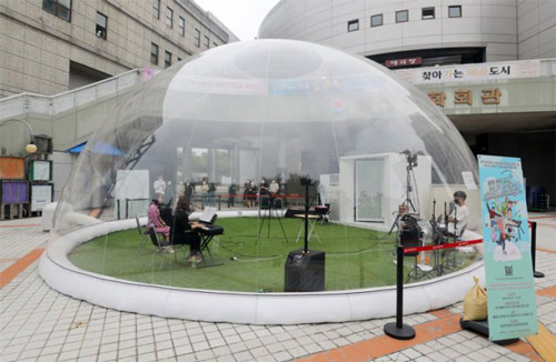 7日午後、ソウル陽川区陽川文化会館前広場に設置されたエアドーム舞台で音楽人たちが公演をしている。ヤンチョン文化財団はコロナ19で萎縮した公演活動に希望を与える音楽祭「ヤンチョンミュージックリーグ」を8日まで1日3回進行する。