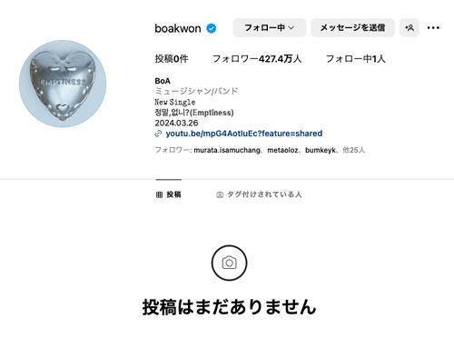 本日(9日)午後4時30分基準、BoAのInstagramからこれまで掲載されていたすべての投稿が削除された。現在、彼女のアカウントにアクセスすると、「投稿はまだありません」という文言だけが表示されている。
