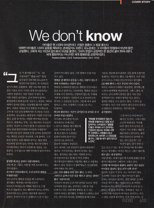 「そんなことが好きです。」「さて、それでは行きましょうか?」「大丈夫ですか?」撮影中途中のスローガンのようにユノユンホが叫ぶように言う。着沈した空気がウィリック、循環する。本当にスローガンのようにうまくいくような気持ちもする。これはきっとユノユンホという人の性質だ。一部の人は重いです。またある人は鋭い。あえて言わなくても撮影場で一緒にいるとオーラが感じられる。それぞれに魅力があるが、働く立場では活気のある人がいい。人は人に会って影響を与えたり受けたりする。わずか数時間余り一緒だがやりとりする時間は十分だ。ユノ・ユンホは撮影場に涼しい何かを与えた。運動後に飲む涼しいビールのように全身を突き刺し、貫通する何。彼はしっかりと自信があふれる。自分が誰なのか何ができるのか知っている。10年間鍛えられたアイドルの姿勢だろうか?それとも10年間頂点に立った男の性情なのか?どちらにしても10年間持続すればそれが真だ。彼は夢を言う。普通の時なら夢だな、やったのに不思議に説得力ある。アイドル帝国韓国でアイドルという意味が到達する頂点を彼は夢見る。彼が今後どんなアイドルになるのか誰も知らない。