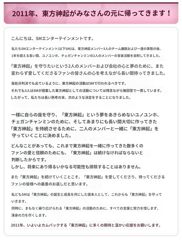 月見草様ブログより こんにちは。 今日は14年前、2010年11月23日、東方神起が2人体制で再び活動を開始するというお知らせがあった日です。 ファンの間ではピンクお知らせというのにこれがもう14年という時間が流れてしまいましたね。 2012年の訴訟は結局、両側の合意で終わり、その過程がとても多かったです。 現在もこれを見る個人の考えと意見が分分していますが、いつも判断はそれぞれの役割です。 そういう意味でピンクのお知らせとともに訴訟関連資料を見ることができるサイトへのリンクを持ってきました。 古いことだと覚えていない部分もあり、知らない方もいらっしゃるようです。私も定期的に復習しています。 そして当然、私は今の東方神起を支持します。 ほとんどの東方神起を応援するファンの方々は似たような気持ちではないかと思いますが、出てきた方々とはどのような形式でも結びたくありません。彼らもそう思ってくれたらいいですねㅎ 過去も重要です。今の私は過ぎ去った過去を通して作られたから。 しかし、それでも過去の栄光だけを見て生きることはできません。現在と未来を見なければならない。 大変な時間を一緒にしたファンたちの心を知っているので、東方神起二人はいつも二人という点をさらに強調するようです。そんなことが本当に限りなく感謝するだけです。