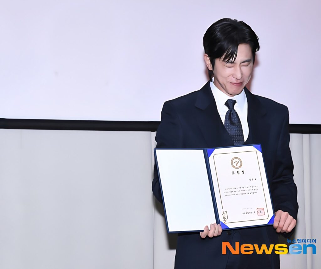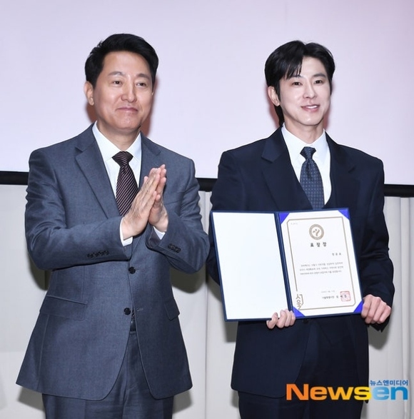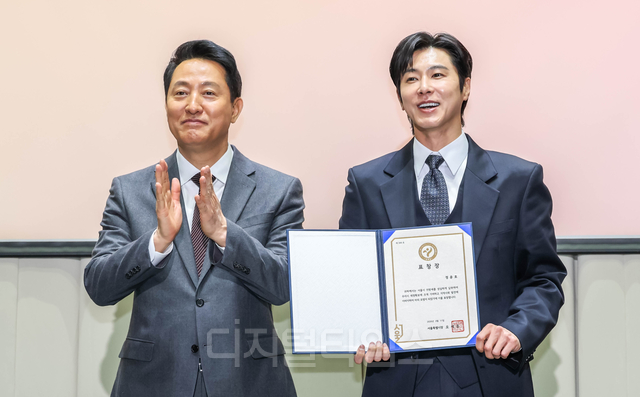 歌手のチョン・ユンホ(ユノ・ユンホ)は、11日、ソウル市庁舎で開催された「2026年ソウル市功労納税者表彰式」でオ・セフンソウル市長から表彰状を受け取り、記念撮影を行っている。