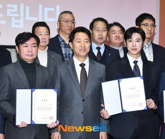 11日午前、ソウル市庁(シチョン)本館3階大ホールで「2026 模範納税者」の表彰式が行われ、東方神起のユンホ、イム・ウォニ、オ・セフンソウル市長らが出席した。
