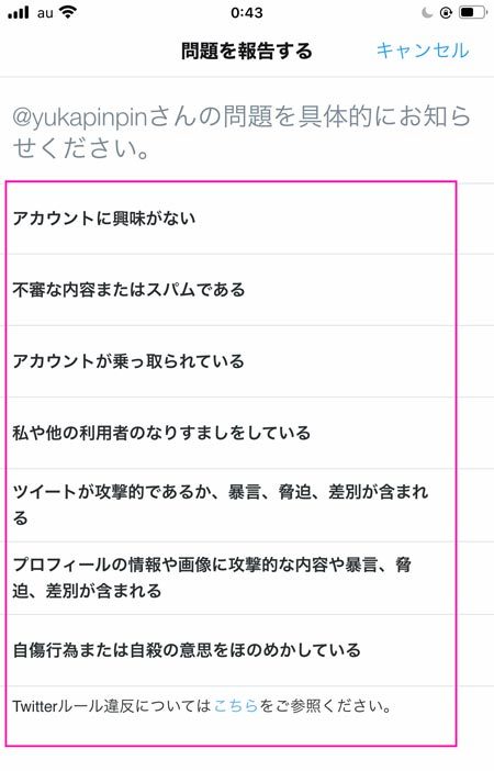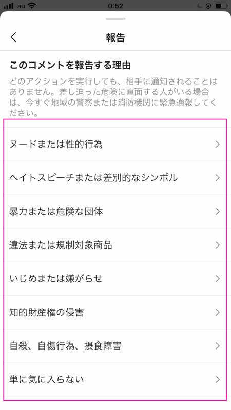 報告する具体的な理由を、9つの選択肢から選んでタップ