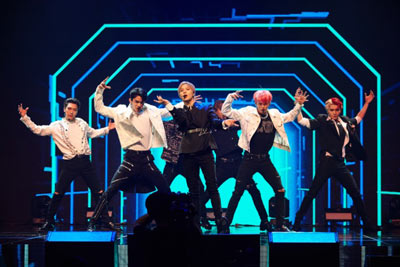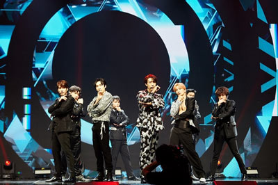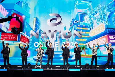 <a-nation online 2020>出演は韓国からの中継だ。イントロから彼らのカリスマ性に一気に惹きつけられるデビュー曲「Jopping」で幕開け。ステージ背面を覆う巨大スクリーンには、朽ちたコロシアムとそれをデジタル化して蘇らせたような映像が交互に映し出された。異次元のような空間で、メンバーはエレクトリックなポップナンバーを一人ひとりの個性を見せながら歌い継いでいく。そしてサビでは一転、7人が一つの塊となってのフォーメーションダンスを披露。1曲目から個々のスキルの高さと、それが一つになったときの爆発力を発揮した。