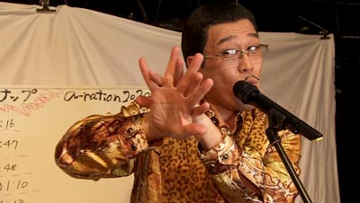 ホワイトボードにピコ太郎さんの手書きで曲名が書かれていて